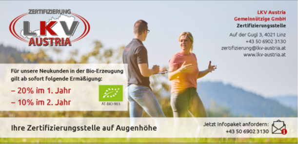 Rund 12.500 Kunden vertrauen bereits auf das breitgefächerte Dienstleistungsangebot der LKV Austria Gemeinnützige GmbH, die somit zu den größten Zertifizierungsstellen in Österreich zählt. Im Bereich der Bio-Zertifizierung gibt es ab sofort für alle LKV Austria Neukunden und Kontrollstellenwechsler im Bereich der Erzeugung attraktive Ermäßigungen.