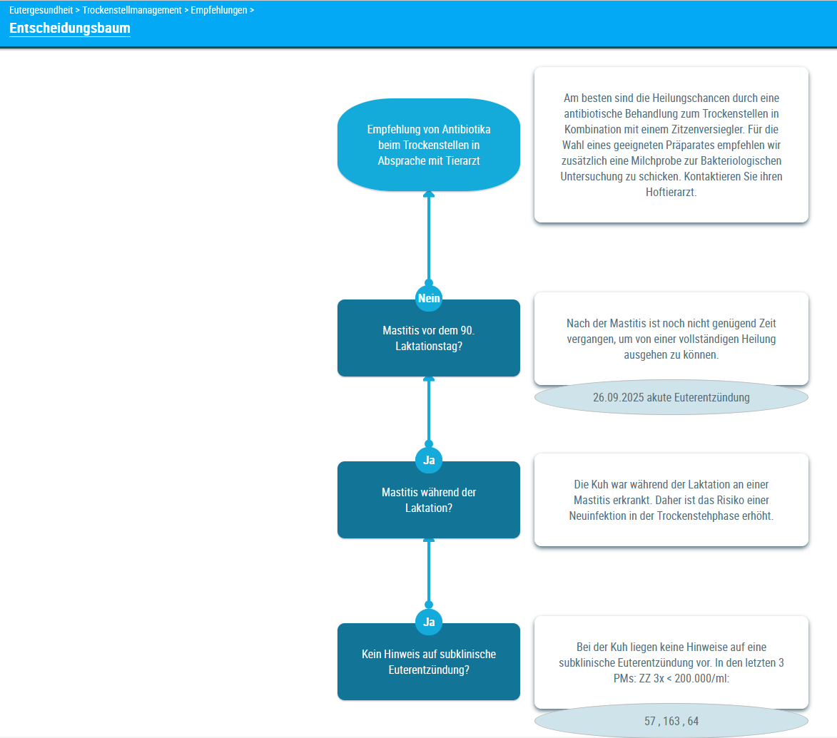 Mitglieder der LKV´s können nun ein neues Werkzeug, das „Trockenstellmanagement“, im LKV Herdenmanager oder in der RDVmobil App, nutzen. Im Rahmen des deutschen Wissenschaftsprojektes IQ-Expert, wurde ein Entscheidungsbaum entwickelt, der dem Landwirt für seine Kühe eine Empfehlung zur Art des Trockenstellens liefert. Hier werden Herdenzellzahlniveau, Zellzahlentwicklung des Tieres und tierärztliche Diagnosen berücksichtigt. Fachlich korrekt, benötigt es in letzter Instanz meist noch ein Schalmtestergebnis, danach wird die Empfehlung angezeigt. Diese lautet entweder „nur mit Zitzenversiegler“ oder „mit antibiotischen Trockensteller und Zitzenversiegler“. Die Empfehlung kann per PC im LKV Herdenmanager, oder auch in der RDVmobil App am Smartphone abgerufen werden.