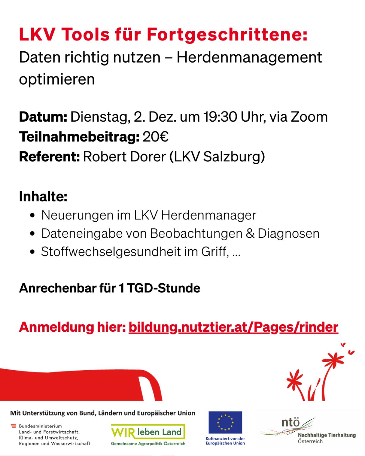 Machen Sie es sich und nutzen Sie die kalte Jahreszeit, um Neues zu entdecken! In unserem Winter-Webinar erwarten Sie spannende Einblicke, praktische Tipps und die Gelegenheit, direkt mit unseren Expert:innen Silvia Maurer (ZuchtData) und Thomas Bacher (Rind Steiermark) ins Gespräch zu kommen.