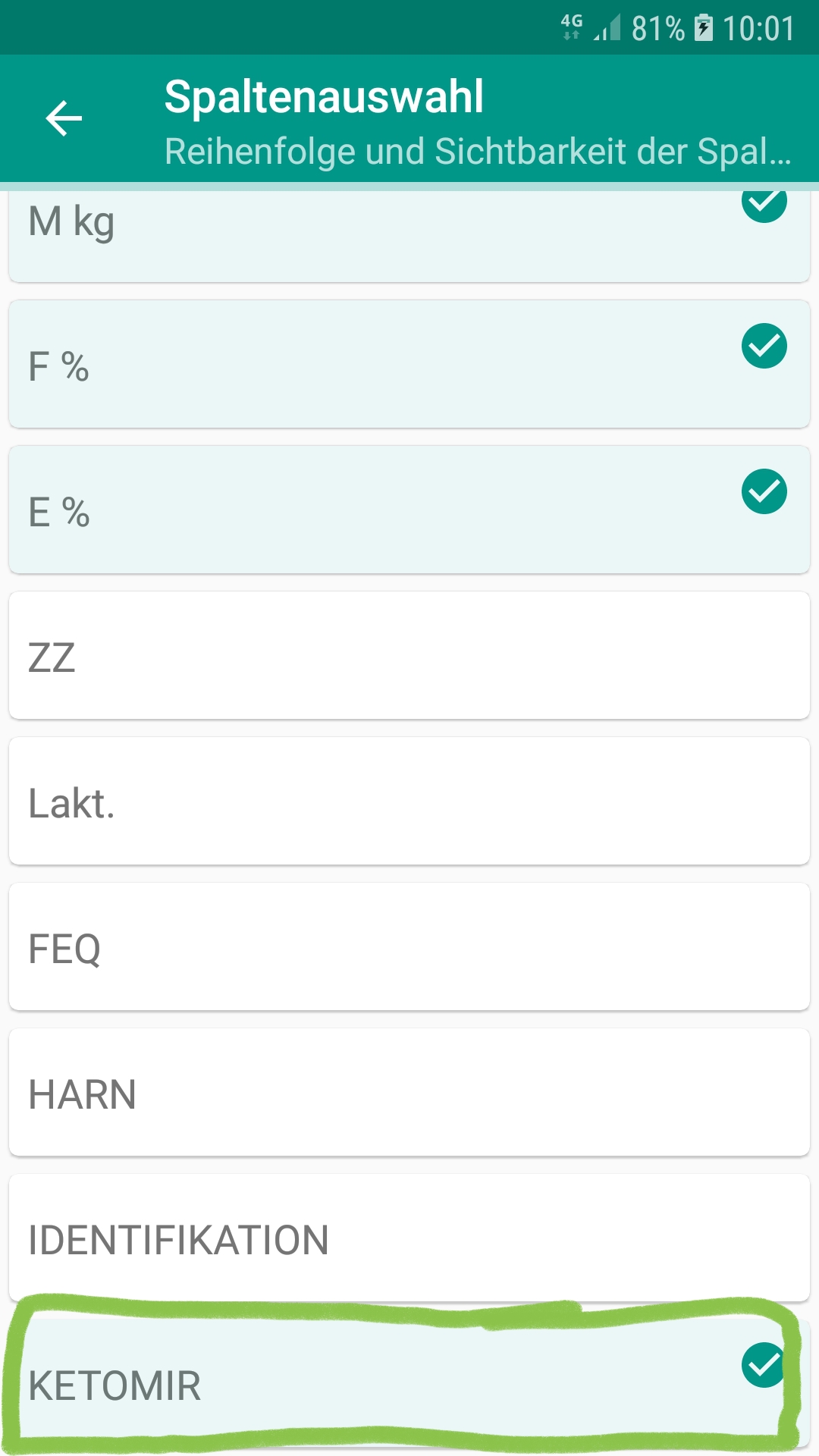 3= Ketoserisiko) nicht nur bei den „Auffälligen Tieren", sondern jetzt auch bei den Probemelkergebnissen angedruckt. Hierfür muss die Spaltenauswahl um die Auswahl „Ketomir" ergänzt werden.