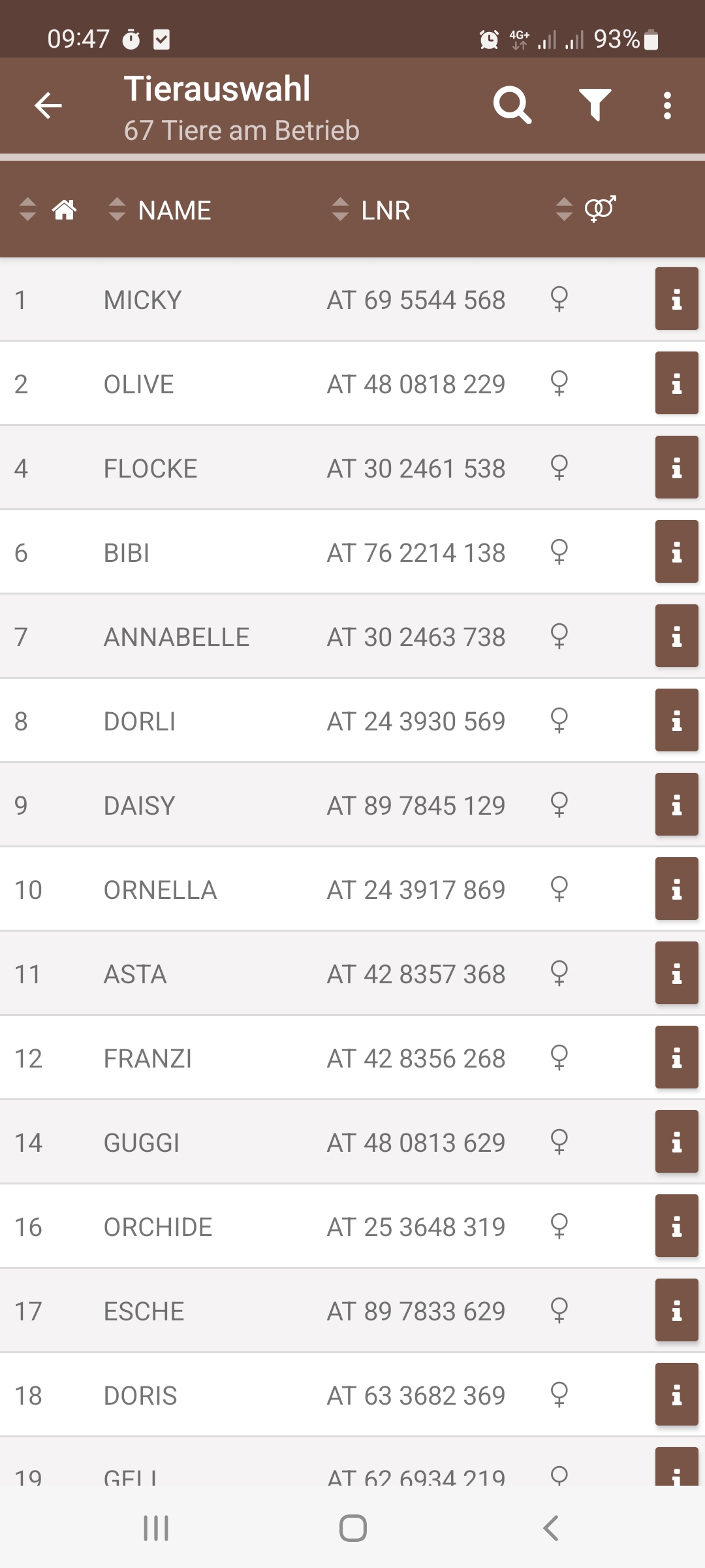 Da der Funktionsumfang der App immer größer wird, musste die Tierauswahlmaske etwas überarbeitet werden. Klickt man auf das neue „i" Symbol ganz rechts bei jedem Tier, so erscheint nun eine Auswahlliste, in der man sich entscheiden kann, ob man weiter zur Tierinfo, zu den gnomischen Zuchtwerten, zur Kälberkachel oder der Änderung des Namens will.