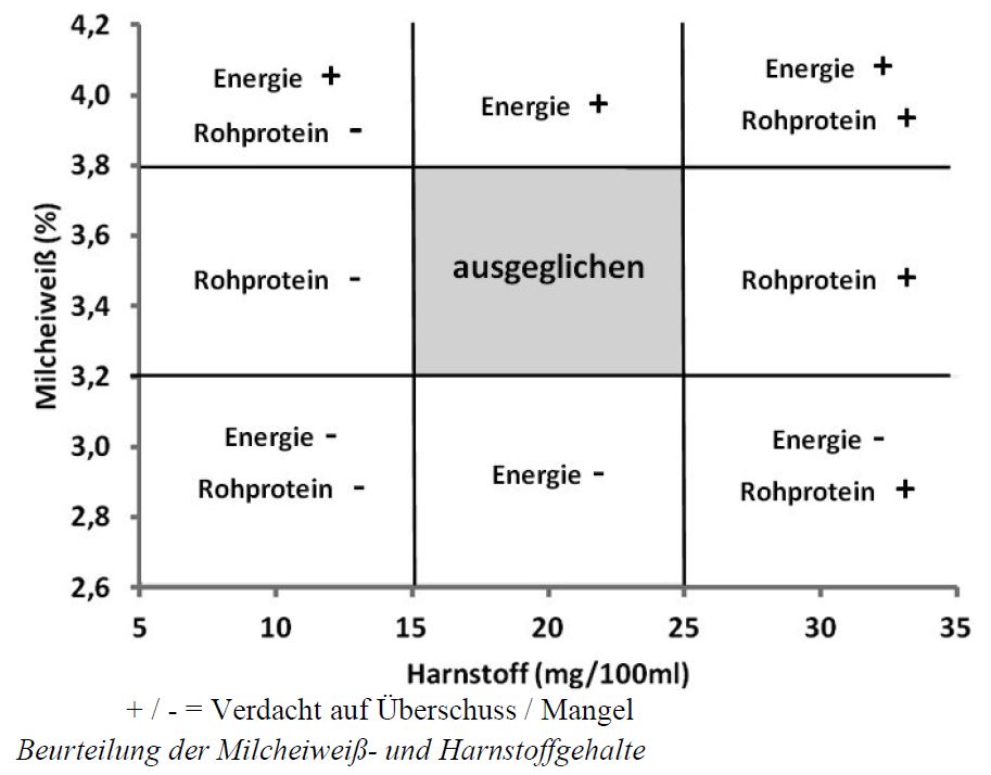Abbildung 1: Beurteilung der Milcheiweiß- und Harnstoffgehalte im 9-Felder-Diagramm (Quelle LFL Bayern)