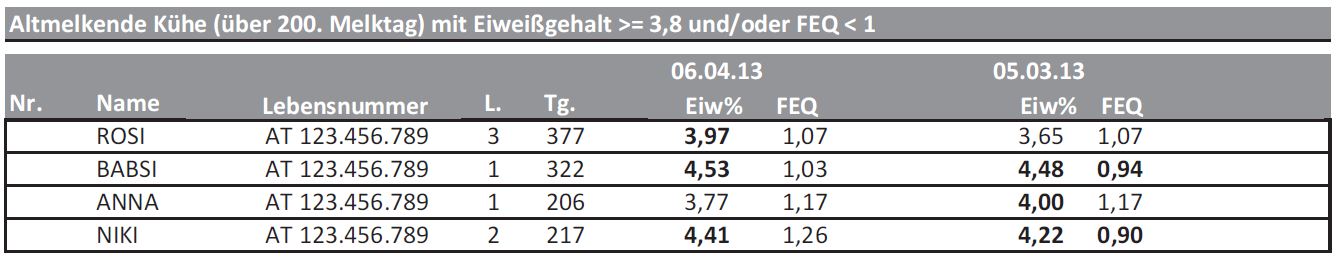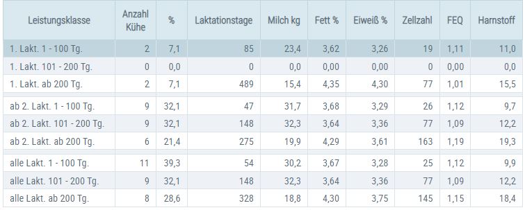 Bevor Sie anhand der Milchinhaltsstoffe Rückschlüsse auf die Fütterung ziehen, sollten folgenden Punkte beachtet werden: Ziehen Sie nur Untersuchungsergebnisse heran, die in einer „Normal"-Situation entstanden sind. Beispielsweise sind Ergebnisse, die am Tag nach der Klauenpflege entstanden sind nicht aussagekräftig. Generell sollten Einzeltierergebnisse nicht überbewertet und stattdessen die Mittelwerte von Tiergruppen (Frischmelker, Altmelker, Erstlaktierende, ...) in den Vordergrund gestellt werden (siehe Abbildung 3). Die Ergebnisse von Tieren in der Kolostralmilchphase, mit Brunst oder schlechter Gesundheit (Euter, Klauen, Gebärmutter, ...) sind nicht besonders aussagekräftig.