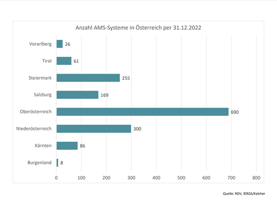 Der Trend bei den heimischen Milchproduzent:innen zur Umstellung auf Automatische Melksysteme (AMS) hält auch im Jahr 2022 an. 200 Betriebe schafften sich in diesem Jahr ein AMS an. Das entspricht einem Plus von 15 %. Damit erhöhte sich der Bestand an AMS in Österreich per 31. Dezember 2022 auf 1.595 Anlagen. 8,8 % der 18.065 Kontrollbetriebe melken bereits automatisch das betrifft in Summe 86.000 Kühe, das sind 19,7 % aller Kontrollkühe. So kommt im Schnitt ein AMS auf 54 Kühe. Die meisten Anlagen stehen derzeit mit 690 Stk. auf den oberösterreichischen Betrieben und damit fast die Hälfte (43 %) aller Anlagen. Es folgen die Bundesländer Niederösterreich mit 300 Anlagen bzw. einem Anteil von 18 % sowie die Steiermark mit 255 Anlagen (16 %). Die meisten Neuinstallationen gab es in den Bundesländern Oberösterreich mit 91 neuen Anlagen oder einem Plus von 15 %, gefolgt von der Steiermark mit 36 neuen Anlagen (+16 %) und Niederösterreich mit 35 (+13 %).