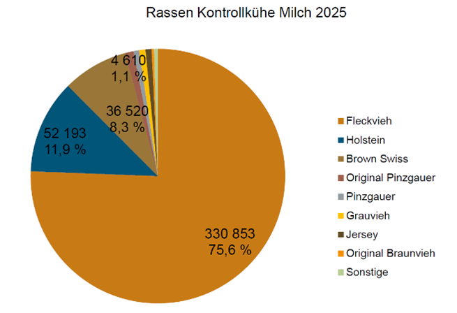 Rassenverteilung der Kontrollkühe (Vollabschlüsse, Milch) in Österreich im Kontrolljahr 2025.