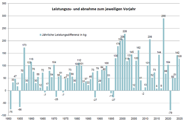 Jährliche Milchleistungsdifferenz in Österreich seit 1950.