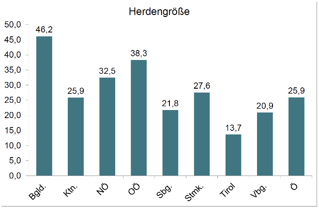 Die durchschnittliche Herdengröße der Kontrollbetriebe stieg leicht auf knapp 26 Kühe pro Betrieb. Die größten Bestände finden sich traditionell im Burgenland mit 46,2 Tieren, während Tirol mit 13,7 Tieren weiterhin die kleinsten Strukturen aufweist. In absoluten Zahlen bleibt Oberösterreich mit 133.000 Kühen das stärkste Milchviehbundesland, Tirol weist die meisten Betriebe mit insgesamt 4.200 auf.